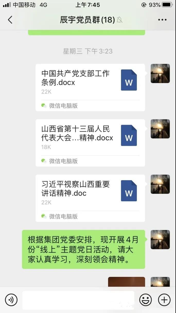 此次活動為線上學習,黨支部統一將《中國共產黨支部工作條例(試行)》《山西省第十三屆人民代表大會第三次會議精神》等學習資料發送至QQ群,要求全體黨員和入黨積極分子認真學習,深刻領會。通過此次主題黨日活動,大家紛紛表示要時刻用黨員標準嚴格要求自己,立足崗位、奮發有為,為更好地建設辰宇公司貢獻力量。