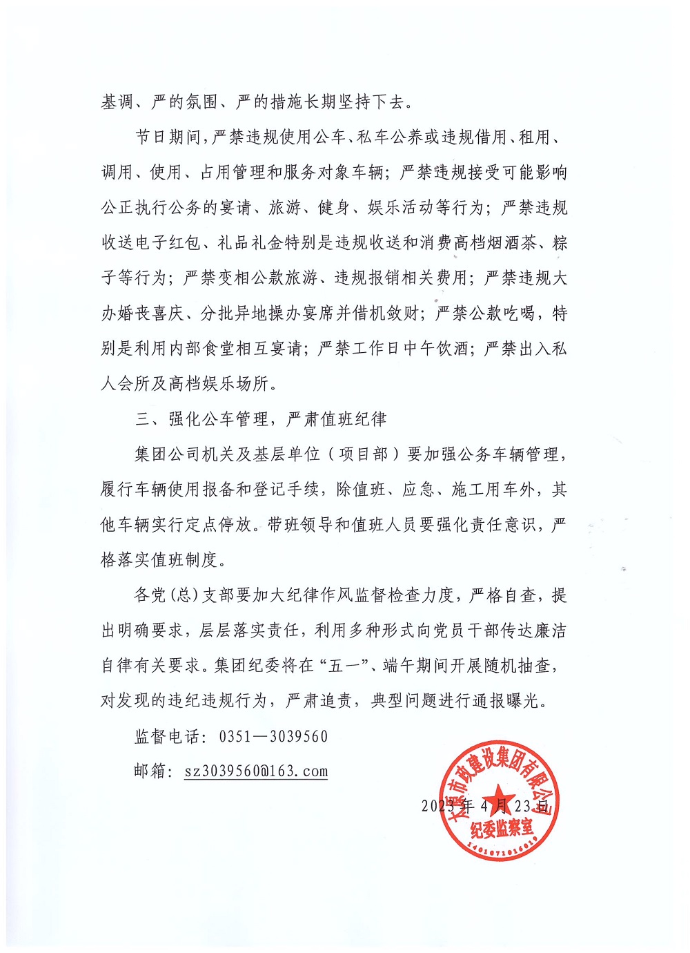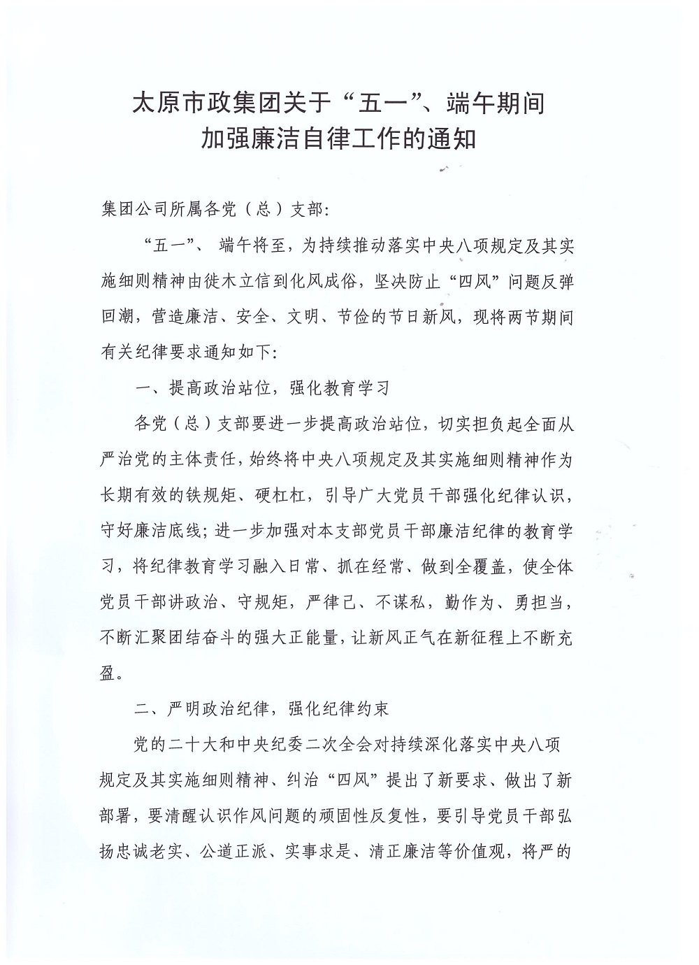 太原市政集團關于“五一”、端午期間加強廉潔自律工作的通知