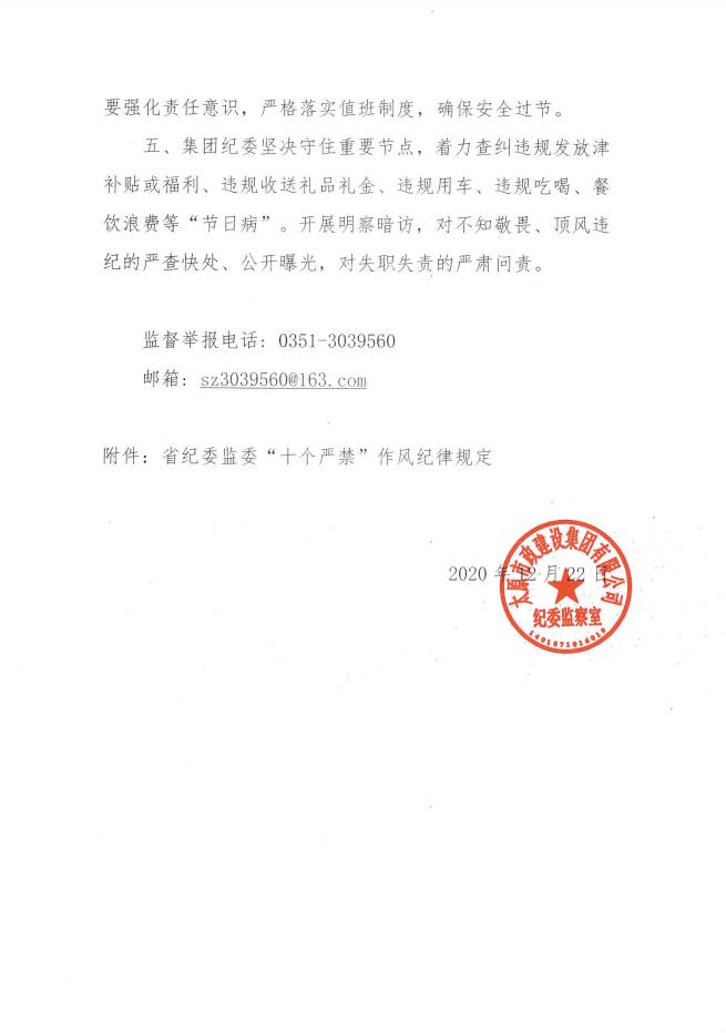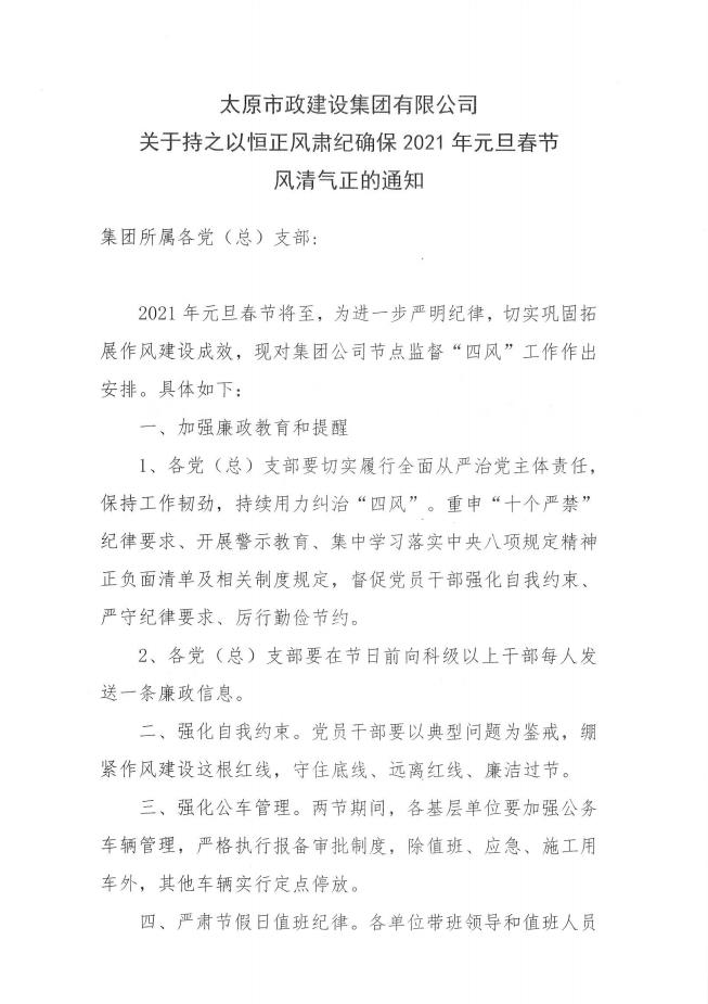 太原市政建設集團有限公司關于持之以恒正風肅紀確保2021年元旦春節風清氣正的通知