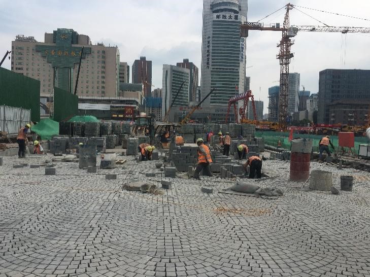 該工程包括七條道路及管網的施工建設,其中涉及大量人工進行花崗丁石的鋪裝任務,項目部結合實際、統籌管理,將七條道路分為三個工區,形成各條道路互不影響、全面鋪開的施工局面,各工區針對鋪裝關鍵點進行隨時監測,組織施工人員全天候盯守現場,及時監測石材鋪裝過程,嚴格把控鋪裝紋路、石材縫隙、打磨程度等,確保鋪裝質量達到規定要求。目前,該工程已進入全路面鋪裝階段,平均每天有260多名民建隊人員參與石材鋪筑,項目部將整個隊伍按照花崗巖“切割、鋪裝、灌縫、打磨”的施工環節進行分組,各組全面負責一道工序,極大提升工作積極性,形成相互促進、互相學習的良好氛圍,并采用分段鋪裝打磨的方式,有效提高施工效率,保證施工進展。
