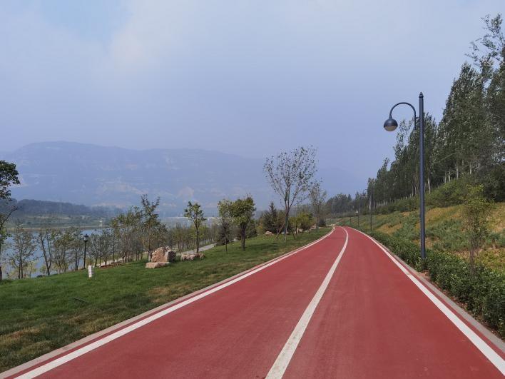 山光凝翠,川容如畫。9月13日,隨著西岸堤頂路彩色陶瓷顆粒的鋪設完畢,汾河景觀帶工程猶如兩條紅色的長龍,蜿蜒在汾河兩岸,為城市增添了一抹絢麗的色彩。