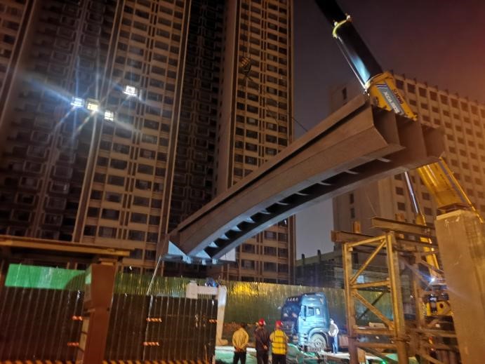 十四項目部承建的文興路匯豐南街人行天橋工期緊、任務重,項目部科學組織施工,合理安排工期,于9月16日晚完成鋼箱梁主體吊裝,目前正在進行橋面鋪裝作業。施工中,為保障工程總體進度及減小周邊交通影響,項目部決定箱梁運輸及吊裝施工均在夜間實施,并只在主橋鋼箱梁吊裝時全部封閉機動車道。吊裝作業時,安排專人統一指揮吊裝作業,嚴格要求吊裝操作人員掌握安全技術操作規程及遵守“十不吊”原則,全力保障箱梁吊裝施工安全順利推進。同時,由于濱河東路翠鑫路天橋所處地段原因,項目部在前期樁頭施工中,采用鋼板樁支護的方式有效解決現場沙土質容易產生塌方的情況,為實現節點目標打下堅實基礎,該天橋正在進行鋼箱梁焊接施工。