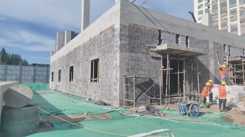 該工程主體結構施工主要包括鋼筋綁扎、模板安裝、混凝土澆筑三道工序,參建人員強化全過程管控,通過細化綁扎流程、細化安裝步驟、細化澆筑過程“三個細化”,確保主體結構施工穩固與安全。細化綁扎流程,項目部精準定位鋼筋綁扎具體點位,結合首次承接鋼筋用量達1600多噸的施工情況,提前組織人員學習鋼筋綁扎的技術規范和要點,仔細核對鋼筋型號、尺寸及數量,確保與設計圖紙一致,綁扎時嚴格確保位置、間距和交叉點的牢固,以形成穩固的結構體系,并多次復核檢驗鋼筋綁扎數量及搭接長度、焊接飽滿度、鋼筋間距等指標是否規范,保證驗收合格后接續進行模板安裝。細化安裝步驟,項目部按照測量放線位置,確定模板標高、垂直度,以鋼筋為基準,圍繞其四周進行模板固定,利用木方將模板逐一進行固定,組織工長、質檢員等挨個檢測安裝厚度、方木密度及對拉螺栓強度,確保安裝穩固、支架安全。細化澆筑過程,項目部及時檢測混凝土坍落度、標號,采用“分層對稱澆筑”施工方法,每完成一層澆筑后進行振搗,保證表面光滑,并及時苫蓋塑料膜進行養護,保證澆筑整體一次成型。