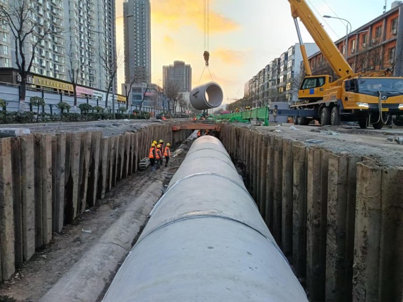 該工程位于勝利街,工程北澗河至解放路段道路全長1.74公里,規劃紅線寬度50米,污水管線主線長度為1919.5米,雨水管線主線長度為888.1米,雨污水管道施工采用明挖法與頂管施工相結合的方式。在新建管線區域,開挖深度超過5米,為確保施工安全,同時最大限度減少對周邊居民區的影響,基坑溝槽采用拉森鋼板樁進行支護。為保證鋼板樁施打位置準確無誤,施工人員在溝槽開挖后先進行場地平整,同時測量員進行定位,每隔兩米在中心線上插入鋼筋頭,以確保標記的準確性。打樁前,施工人員對鋼板樁進行逐個檢查。在插打過程中,實時進行監測,保證每片鋼板樁的斜度不超過2%,樁體打入后,立即進行閉水性檢查,對漏水部位進行焊接修補,并安排專人每日對樁體進行檢查。項目部不斷提升施工安全管理水平,嚴格把控所有環節,確保高標準高質量完成每一項工作。