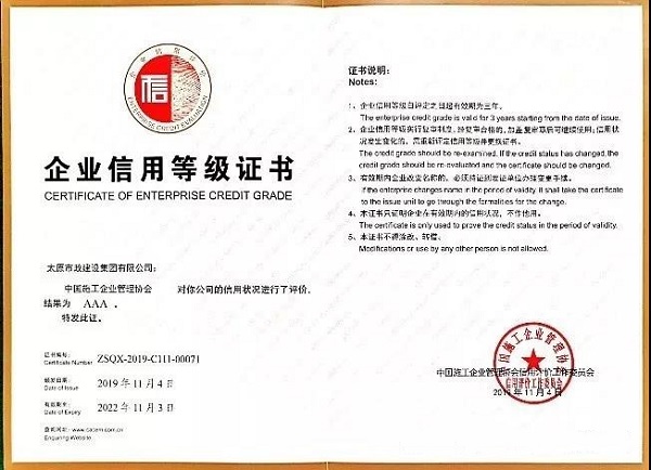 太原市政建設集團有限公司榮獲“企業信用評價AAA級信用企業”榮譽稱號