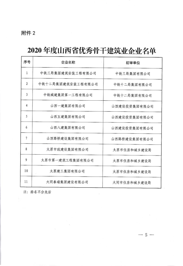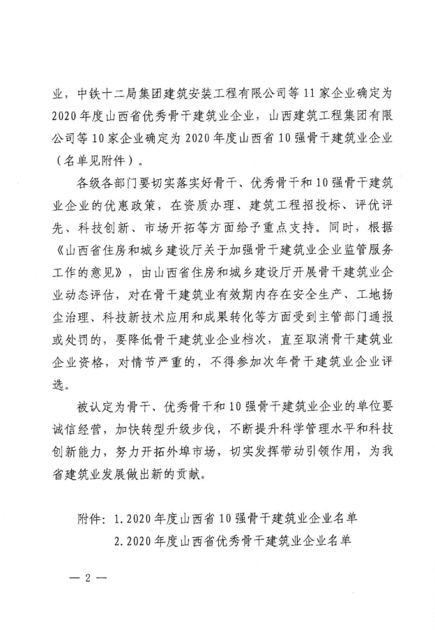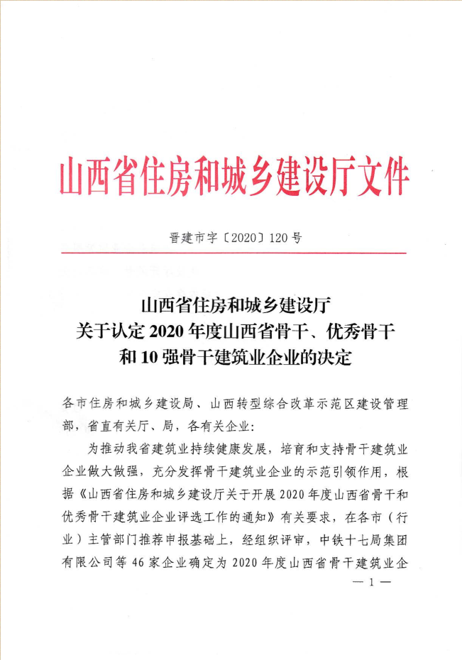 近日,山西省住房和城鄉建設廳發布《關于認定2020年度山西省骨干、優秀骨干和10強骨干建筑業企業的決定》,集團公司再次被認定為“山西省優秀骨干建筑業企業”。