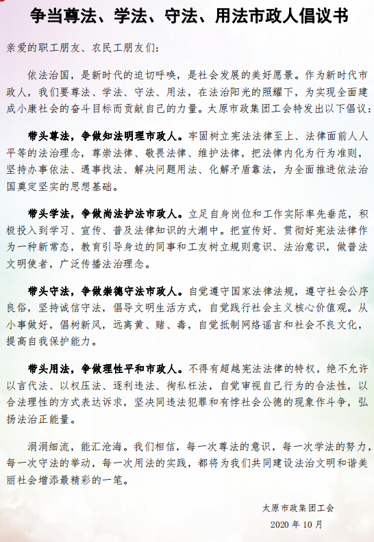 活動中,律師事務所的5名律師現場為職工、農民工進行了法律宣傳和咨詢。集團公司工會工作人員為大家發放了《爭當尊法、學法、守法、用法市政人倡議書》、法律宣傳資料以及活動紀念品。同時,參加活動的職工和農民工在2020年“尊法守法 攜手筑夢”服務農民工法制宣傳行動條幅上簽名。