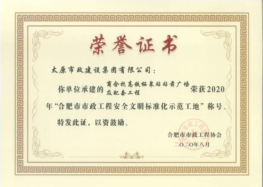 近日,由集團公司承建的“商合杭高鐵柘皋站站前廣場及配套工程”被合肥市市政工程協會評為“2020年合肥市市政工程安全文明標準化示范工地”。