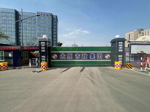 該工程作為太原市今年的重點工程,二公司上下高度重視,開工前召開安全文明施工動員會,要求全員認真執行六個百分百相關要求,提前規劃安全文明施工具體內容,全力打造安全文明標準化工地。項目部認真落實創建綠色文明工地要求,嚴格執行《太原市建設工程安全文明標準化管理手冊》標準,注重創新改善項目部整體外觀形象,重新設計了項目部入口和圍擋,采用反光噴繪布覆蓋工地大門,并對大門周邊輪廓進行不銹鋼條鑲嵌,方便夜間車輛進出工地;在大門門柱上方加裝“帽檐”,四邊用鋼條裝飾,讓大門整體更顯美觀。同時,項目部根據廣場周邊人口密集、商場眾多等情況,在圍擋的設計上進行改良,將傳統的3毫米鋼板改為5毫米鋼板,并用噴繪布全范圍覆蓋,提高了圍擋整體牢固度和美觀度。